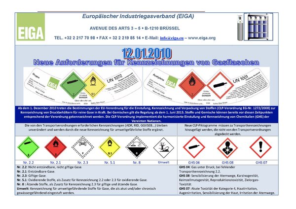 Ab dem 1. Dezember 2010 treten die Bestimmungen der EU‐Verordnung für die Einstufung, Kennzeichnung und Verpackung von Stoffen (CLP‐Verordnung EG‐Nr. 1272/2008) zur Kennzeichnung von Druckbehältern für reine Gase in Kraft. Bei Gemischen gilt die Regelung ab dem 1. Juni 2015. Stoffe und Gemische können bereits vor diesen Zeitpunkten entsprechend der Verordnung gekennzeichnet werden. Die CLP‐Verordnung implementiert die harmonisierte Einstufung und Kennzeichnung von Chemikalien (GHS) der Vereinten Nationen.